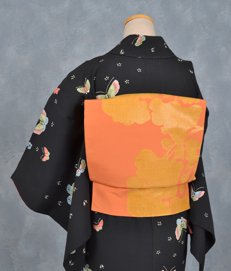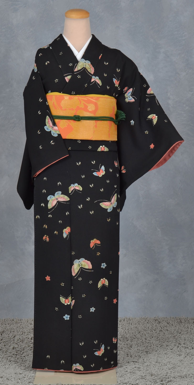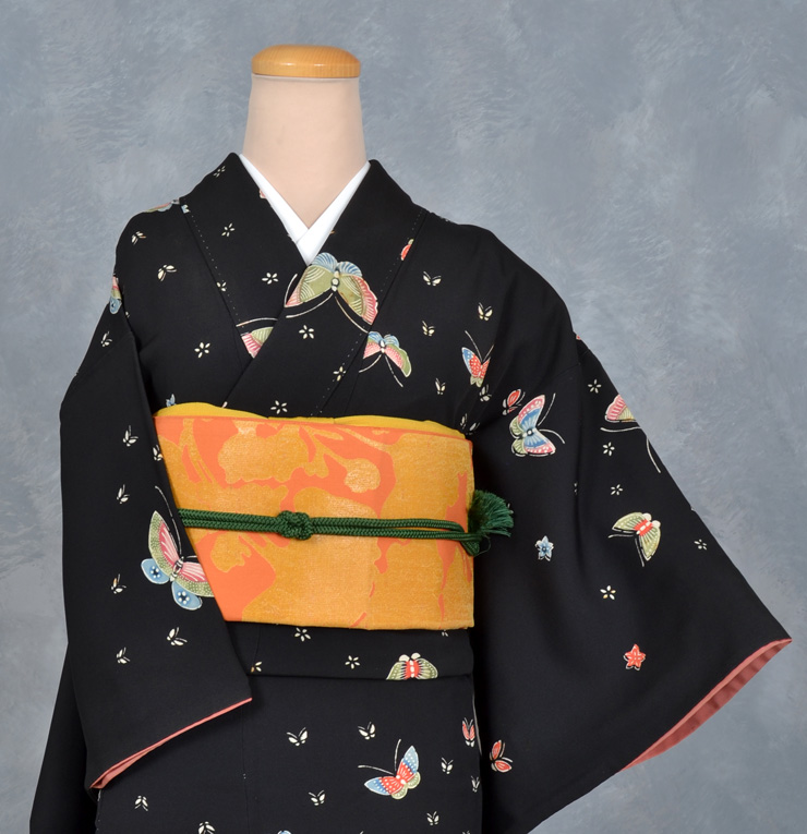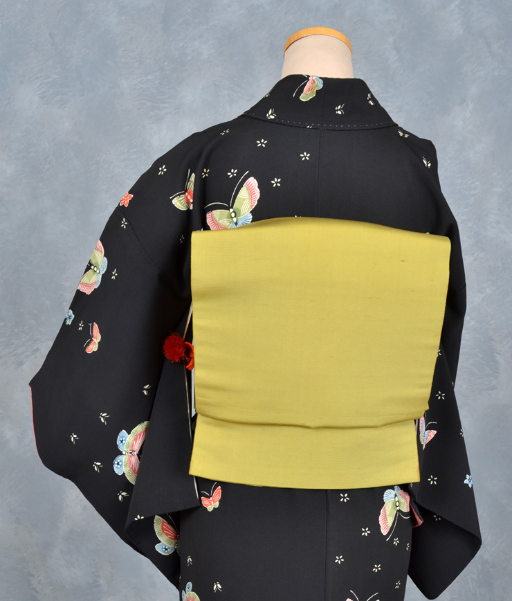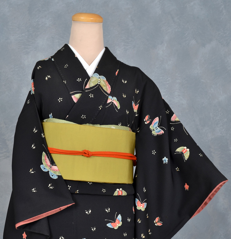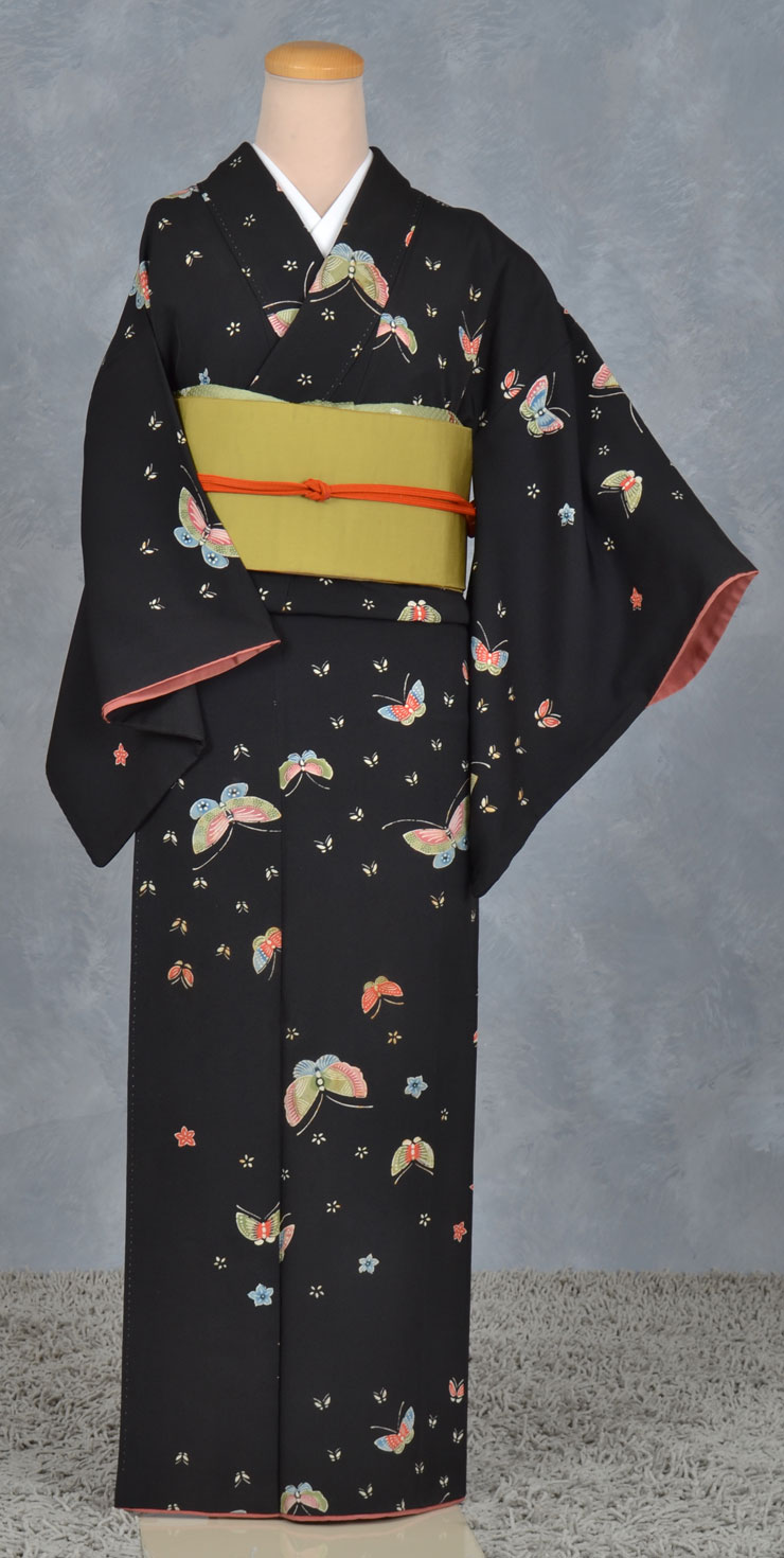 ◆黒地の蝶の紅型小紋にしゃれ袋帯を合わせた着姿です。(2012年3月掲載の蝶の小紋は
