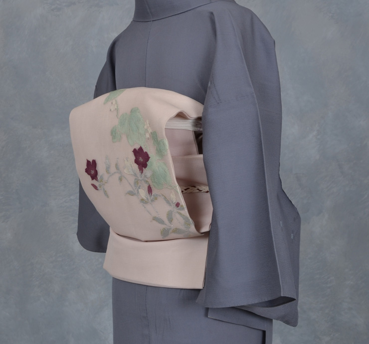 紫の花の色彩と薄緑の野葡萄の葉の色が美しい帯です。