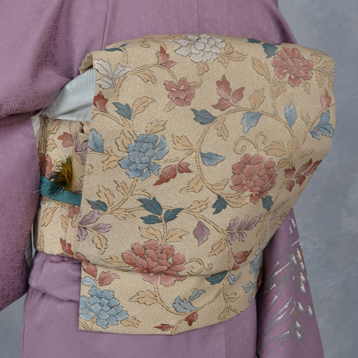 帯は姉妹店「おりいぶ」で求めた「牡丹唐草模様」支那綴の名古屋帯です。
