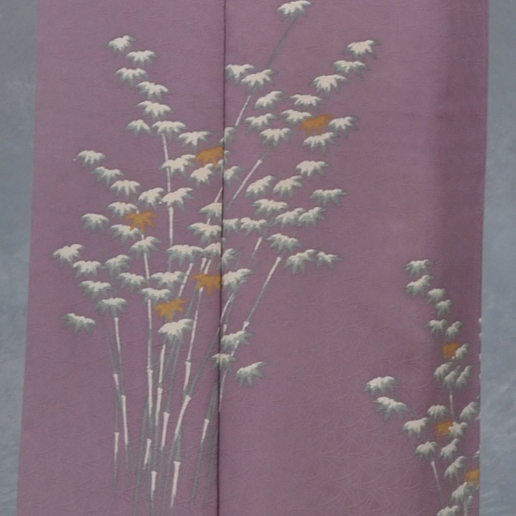 この着物は、篠竹に雪が降り積もった様を染のみで表現した訪問着です。